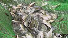 ネットに押し寄せるティラピアの大群は、平均身長185cmの