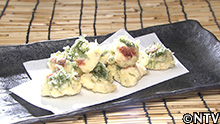 梅干しと紫蘇の身の間に挟み、天ぷら粉をつけて油で揚げた『梅紫蘇天』。