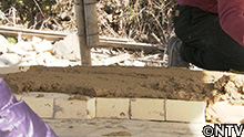 糸を張って目安を作り、そこに合わせるように土を盛っていく。 |