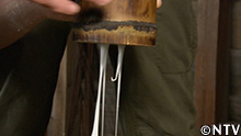 急きょ作った、竹筒の底に穴を空けた特製の製麺機で