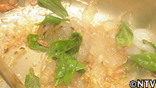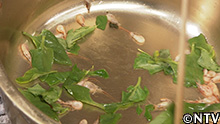 ごま油の代わりに島で搾ったアケビ油で、エビとツルナを炒める。