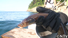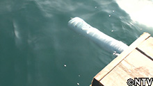 今回は、島で捕まえたアジを筒の中に入れて。 |