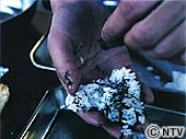 | 手の平に塩を少しふり、その上にご飯をのせ、真中に(2)を入れる。 | ![]() |