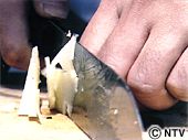 | 竹の子の下の部分を切り、縦4等分に切り、それを薄切りのいちょう切りにする。 | ![]() |