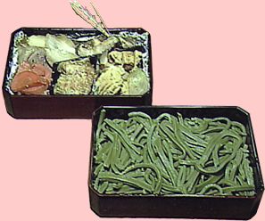 | そば粉と小麦粉を混ぜ、それに水で溶いた抹茶を少量ずつ加えて練る。 | ![]() |