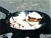 | ダシ汁に醤油・砂糖・酒・七味唐辛子を加え、沸騰したら玉ねぎ・しいたけを入れ、煮る。 | ![]() |