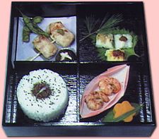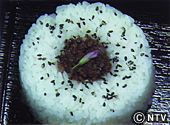 | ごはんを型抜きし、真中をくぼませ(1)をつめ 周りに黒ごまをふりかけ出来あがり。 |