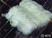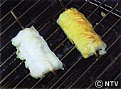 | (2)をさらに半分に切り、1つに白ごまをすり、1つに白味噌・砂糖・みりん・塩をすり合わせたものを塗り、網の上で更に焼く。 | ![]()