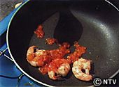 | えびの背ワタを取り除き、塩・コショウ・醤油・油で 下味をつけ、フライパンで炒める。火が通ったら (2)のチリソースを絡めて出来上がり。 | ![]() |