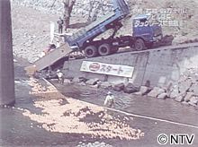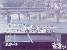 西土佐村村長 宮畑耕三さんの合図で、レーススタート!5000匹のアヒルたちが次々と清流へ飛び出す。