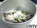 中骨、腹の所の骨を取り除き、細かく切り、包丁で粘りがでるまで叩く。