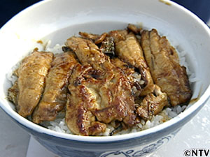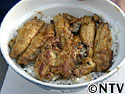 どんぶりにごはんを盛り、その上に蒲焼をのせ、たれをかけて完成