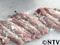 2のいわしに小麦粉を少量まぶしてフライパンに油をひいて両面焼く