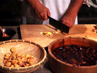 煮立てただし汁の中に丹波栗・なす・ニンジン・ゴボウを投入し、約30分煮詰める。