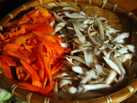 丹波栗・なすは薄切り。ニンジン・ゴボウはささがき。ほうれん草はぶつ切りにする。