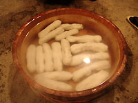 拳ほどの大きさにちぎったしんこを、せいろで30分ほど蒸す。蒸しあがれば、生地を麺台にのせて耳たぶの固さくらいになるまで練る。練りあがれば、200gくらいの大きさにちぎって棒状にする。それを35℃から40℃になるまで水につけて冷やす。 |
