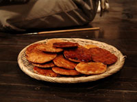 網の上で焼く。2〜3秒ごとに煎餅をひっくり返し、膨らんできたら押し瓦で押さえつける。少し焦げ目が出来れば皿の上にあげて、タレを塗る。乾燥すれば煎餅の完成。 |