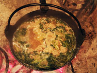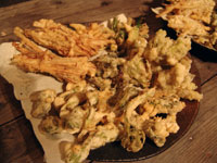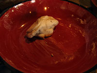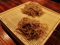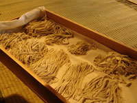 材更科粉600g、湧清水300ml(お湯も含め) 熱湯で「湯ごね」することで粉内の粘り成分、グルテンをうまく引き出す。 水分調整(目安はそば粉の約半分)。水っぽくなり過ぎない様、少しずつ様子を見ながら。水分を含んだ小さな玉をまんべんなくつくる。 丸める時は全体重を手元に集め、指先で掴みながら固めていく。 延しの基本は押して延ばしていく。まずは円形に、そして四角く。打ち粉をうまく使い、延し棒に粘らないように。 「ハの字」を意識して切る。 盛りそばの最大のポイントは「茹で方」。多めの沸騰したお湯で茹で時間わずか15秒。あらかじめ湯の中に浸したザルの中で一気にすくい上げる。茹で時間が長くなると、そばの香りが飛ぶだけでなく細いため特に切れやすい。 ねぎ・紅葉おろし・わさび・生姜を薬味に、囲炉裏を囲み、みんなでいただく…。 そばづくしの春の食卓でした…。 戻る