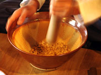 乾燥し終わったものを180度の油で、茶色づくまであげる。ポイントは、揚げる時全体にまんべんなく火が通るように、かき混ぜながら揚げること。