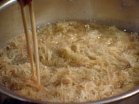 テングサを煮て抽出した寒天液を、鍋で火にかける。