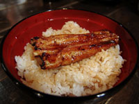 焼き上がった鰻にタレを塗り、ご飯の上にのせれば完成。
