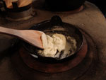 漉し上がったものを鉄鍋で熱しながら練り、徐々に砂糖を加えていく。一度に入れるとダマになってしまう為数回に分けて入れる。砂糖の量は漉し上がった芋の半分の重さ |