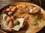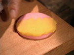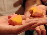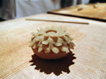 漉し上がったものが薯蕷(じょうよ)練りきりとなる。2度漉す事で練り切りになめらかさ、こしが出て形を作りやすく、食感も軟らかくなる。