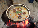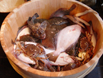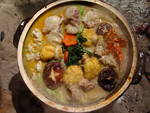 さらに煮立てて、具が煮立ってくれば、アンコウの切り身と肝、カレイのつみれ、酒粕餅きんちゃく、シイタケ、油揚げ、春菊を入れる。