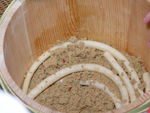 一斗樽に5本程の守口大根と、人参を入れて糠で漬け、室温5〜 10 度の室で保管。 適宜かき混ぜる。