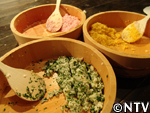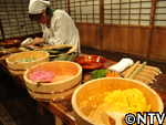 ある程度混ざったら、1升分の酢飯を3等分し、赤色飯には梅酢、黄色飯にはカボチャのペースト、緑色飯には大根葉の塩漬けのみじん切りを混ぜる。これで酢飯は完成。