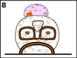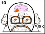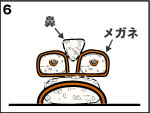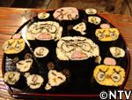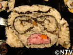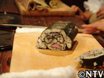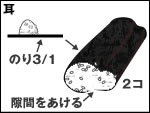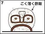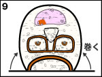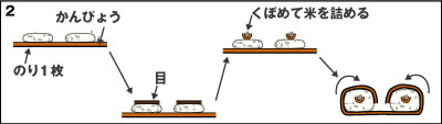 酢飯は中央部に2センチ程隙間をあけてひきます。その上に目になる部分のパーツをのせます。この時、目の向きが反対にならないように注意して下さい。目を置いたら、両側から中央部に向けて巻きます。巻き終わったら、眼鏡をかけた目のパーツが出来上がりです。 |