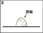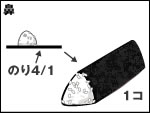 1/4の大きさの海苔の中央部に酢飯をのせて巻く。巻いたら、三角形に形づくる。 |