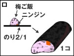 1/2の大きさの海苔に、ニンジンを置き、赤色飯をのせ、巻きます。巻き終わったら、全体を楕円形にします。 |