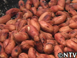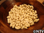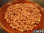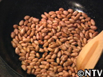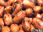 フライパンに油をしき、薄皮付きの落花生と塩を入れ、炒める。