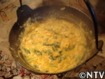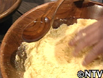 煮立ったら、トウモロコシの粉をだまにならないように少しずつ入れ、とろりと固くなるまで練る。
