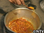 Bにチリパウダー大さじ2・ターメリック大さじ1・塩小さじ1を入れ、さらに2〜3分炒める。 |