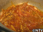 Dに刻んだ野菜を入れ、数分炒めたら、野菜が浸るくらいの量を入れて10分煮込む。 |