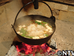 沸騰した「だし汁」に具材を入れ、醤油、ショウガを入れて味を整える。