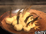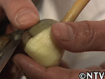 灰汁抜きしたクワイの皮を六角に剥く。【六角形は亀の甲羅を表す、縁起物】