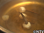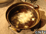 160℃の油で半分に切ったクワイを揚げる。【揚げ時間:約5分】