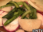 魚をさばき、身だけの状態にする。 細かく刻んだ身を冷水でさらし、ウロコや小骨を取り除く。 水でさらした身の水分をきり、塩を足し強い粘り気がでるまですり鉢で念入りにねる。 粘り気が出たら木の板にかまぼこの形を成形する。 90℃の蒸し器で30分程蒸せば出来上がる。 小松菜、長いも、赤かぶを塩、砂糖、西洋ワサビで一晩漬け込む。 戻る