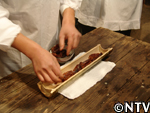 干し柿のヘタを取り縦に4等分に切ったものを青じそで巻く。