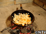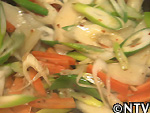 ニンジン、マコモ、油あげを油で炒め、醤油、塩、酒、みりん、だし汁を加える。