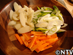 マコモタケ・ネギはななめ切りに、ニンジンは短冊切りにする。ニンニクは薄切りし、唐辛子は輪切りに。