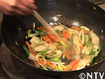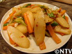 ニンニクの香りが出たら、マコモタケとニンジン、ネギを炒める。塩、醤油、砂糖、みりん、唐辛子、豆板醤は酒に溶かして加える。