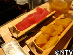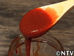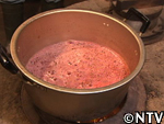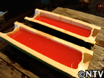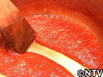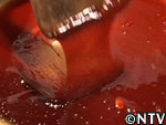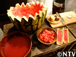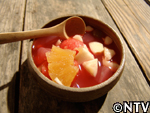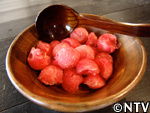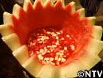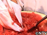 スイカの産地では昔から作られていたが、今は主に熊本で作られる。スイカの果肉を漉し、出てきた果汁を煮詰めて作る。ビタミンやミネラルなど有効成分が凝縮されているので、腎臓の薬として服用されている。紅茶やヨーグルトに入れたり、そのまま舐めて食す。約1年は保存できる。 スイカの実をくり抜く。 水分が出易いように、くり抜いた実をすり鉢で潰す。 すり潰した実をサラシで濾す。 漉した液体を中火で煮詰める。 約30分煮つめると液体と糖分が分離し始め、鍋の周りに赤い色素が付き始める。 ハチミツの様にとろとろになってきたら完成。2.5Lの果汁が180mlまで減った。 ジャンボスイカ半分、寒天棒1本、林檎1個、ぶどう1房、水300cc、パイナップルのシロップ煮 スイカの実を計量スプーンで丸く繰り抜く。 残りのスイカをスイカ糖と同様にすり潰す。 寒天棒を水に浸し、煮詰め、溶かす。 Bにこしたスイカ汁を200cc入れ、混ぜ。竹の器に流し込む。 固まった寒天、村のパインのシロップ煮、リンゴを切り、ブドウの皮を剥く。 中身を繰り抜いたスイカの切り口を包丁でギザギザに切る。 スイカの器にスイカ汁の残りとシロップ、具を入れ、盛りつけ。完成。 戻る