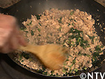 鍋にエゴマ油を入れ、大根の葉を炒める。