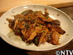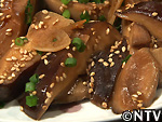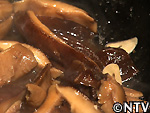 鍋からシイタケを取り出し、だし汁、醤油、薄切りにしたニンニクを入れ、下味をつけ、もう一度、炒める。
