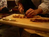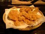 の行程が終わったものを、薄く切り、180℃の油へ。しょう油をかけていただく