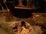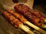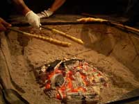 の行程が終わったものを、小さく丸める。それに食紅・黒胡麻をまぶしたあと竹串に刺し、囲炉裏で焼く。
